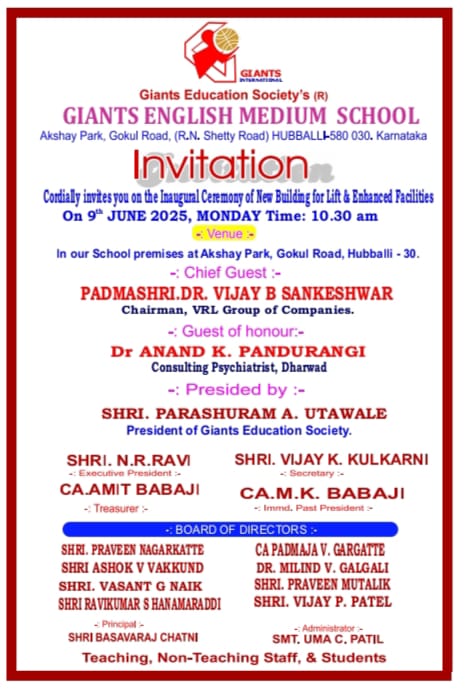 ಜೈಂಟ್ಸ್ ಎಜುಕೇಷನ್ ಸೊಸೈಟಿ ಅಧ್ಯಕ್ಷ ಪರಶುರಾಮ ಊಠವಾಲೆ, ಸಂಸ್ಥೆಯ ಸಾಧನೆ ಮತ್ತು ಮುಂದಿನ ಯೋಜನೆಗಳ ಕುರಿತು ವಿವರಿಸಿದರು. ಎನ್ಸಿಸಿಯಲ್ಲಿ ಸಾಧನೆ ಮಾಡಿದವರನ್ನು ಗೌರವಿಸಲಾಯಿತು. ಸೊಸೈಟಿಯ ಪ್ರಮುಖರಾದ ಎನ್.ಆರ್. ໖. , 2 ៩, ಎಂ.ಕೆ. ಬಾಬಜಿ, ಪ್ರವೀಣ ನಾಗರಕಟ್ಟೆ, ಅಶೋಕ ವಕ್ಕುಂದ. ವಸಂತ ನಾಯಕ, ರವಿಕುಮಾರ ಹನಮರಡ್ಡಿ, ಪದ್ಮಜಾ ಗರಗಟ್ಟಿ, ಡಾ. ಮಿಲಿಂದ ಗಲಗಲಿ, ಪ್ರವೀಣ ಮುತಾಲಿಕ, ವಿಜಯ ಪಟೇಲ್, ಬಸವರಾಜ ಚಾಟ್ಟಿ, ಉಮಾ ಪಾಟೀಲ, ಕೆ.ಎಲ್. ಕುಲಕರ್ಣಿ, ಪಿ.ಡಿ. ಪಟೇಲ್, ಸೋಹನಲಾಲ್ ಕೊಠಾರಿ, ಜಿ.ಎಸ್. ನಾಯಕ ಹಾಗೂ ಡಾ.ಎಸ್.ಆರ್. ಹನಮರಡ್ಡಿ ಇದ್ದರು.