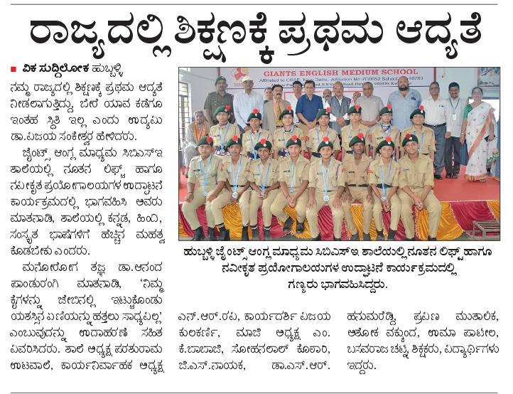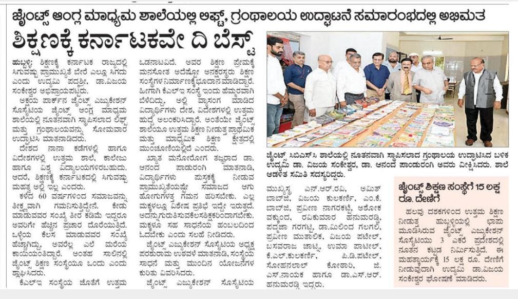 ಜೈಂಟ್ಸ್ ಶಾಲೆಯಲ್ಲಿ ನೂತನ ಲಿಫ್ಟ್, ಗ್ರಂಥಾಲಯ, ಮೂಲ ಸವಲತ್ತುಗಳ ಲೋಕಾರ್ಪಣೆ ಶಿಕ್ಷಣಕ್ಕೆ ಪ್ರಾಮುಖ್ಯ ಸಂತಸದ ಸಂಗತಿ ಶಿಕ್ಷಣಕ್ಕೆ ಕರ್ನಾಟಕದಲ್ಲಿ ಸಿಗುವಷ್ಟು ಪ್ರಾಮುಖ್ಯತೆ ಬೇರೆಲ್ಲೂ ಸಿಗುವುದಿಲ್ಲ. ಇಲ್ಲಿ ಅನಕ್ಷರಸ್ಥರೂ ಭೂಮಿ ನೀಡಿ ಶಿಕ್ಷಣ ಸಂಸ್ಥೆಗಳನ್ನು ಬೆಳೆಸಿರುವ ಸಾಕಷ್ಟು ಉದಾಹರಣೆಗಳಿವೆ ಎಂದು ವಿಆರ್ಎಲ್ ಸಮೂಹ ಸಂಸ್ಥೆಗಳ ಚೇರ್ಮನ್ ಡಾ. ವಿಜಯ ಸಂಕೇಶ್ವರ ಬಣ್ಣಿಸಿದರು.