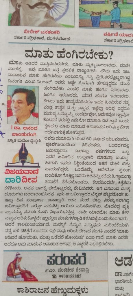 ಮಾತು ಆಡಿದರೆ ಮುತ್ತಿನಂತಿರಬೇಕು. ಮಾತು ಮೃತ್ಯುವಾಗಬಾರದು. ಮಾತೇ ಮಾಣಿಕ್ಯ. ಇವು ಮಾತಿನ ಬಗ್ಗೆ ಪ್ರಚಲಿತ ನಾಣ್ಣುಡಿಗಳು. ಹೌದು ಇದು ಇಜ. ನಾವಾಡುವ ಮಾತು ಹೇಗಿರಬೇಕು ಎಂಬುದನ್ನು ನನ್ನ ಸ್ನೇಹಿತರಲ್ಲೊಬ್ಬರಾಗಿದ್ದ ದಿವಂಗತ ಎಂ.ಬಿ.ದಿಲಶಾದ್ ಅವರು ಅಷ್ಟೇ ಸೊಗಸಾಗಿ ಹೇಳುತ್ತಿದ್ದರು: ಮಾತು ಹೆಂಗಿರಬೇಕು ಎಂದರೆ ಮಾತು ಹಂಗೂ ಇರಬಾರದು. ಹಿಂಗೂ ಇರಬಾರದು, ಯಾರ ಹಂಗೂ ಇರಬಾರದು. ಕೇಳಲು ಇದು ಹಾಸ್ಯವೆನಿಸಿದರೂ ಇದರ ಹಿಂದಿರುವ ಸತ್ಯ ಮಾತ್ರ ಶಾಶ್ವತ ಮತ್ತು ವಾಸ್ತವ. ಇಷ್ಟೆಲ್ಲಾ ಅರಿವು ಇದ್ದರೂ ಮನುಷ್ಯ ಒಮ್ಮೊಮ್ಮೆ ಸಂದರ್ಭವೋ, ಆವೇಶವೋ ಇಲ್ಲವೋ ಕೋಪದ ಭರದಲ್ಲಿ ಏನೇನೋ ಮಾತಾಡಿ ಬಿಡುತ್ತಾನೆ. ಒಂದು ಕ್ಷಣದ ಆ ಮಾತು ಮಾಡುವ ಅನಾಹುತದ ಅರಿವು ಕ್ರಮೇಣ ಅರ್ಥವಾಗುತ್ತ ಹೋಗುತ್ತದೆ.ಅವರು ಸುಮಾರು 55ರಿಂದ 60 ವರ್ಷದ ಯಜಮಾನರು. ಪೂರ್ವಜರಿಂದಲೂ ಸಿರಿವಂತರು. ಒಂದರ್ಥದಲ್ಲಿ ಜಮೀನ್ದಾರರು. ಬಹಳಷ್ಟು ವರ್ಷಗಳಿಂದ ಇವರ ಜಮೀನಿನ ಉಸ್ತುವಾರಿ ಮಾಡುತ್ತಾ ಬಂದಿದ್ದ. ಹೀಗಾಗಿ ಇವರು ನಿಶ್ಚಿಂತೆಯಿಂದ ಆತನ ಮೇಲೆ ಬಿಟ್ಟುಹಾಯಾಗಿದ್ದರು. ಒಂದೊಮ್ಮೆ ಅದೇನೋ ಪ್ರಸಂಗಬಂದಿತೋ ಗೊತ್ತಿಲ್ಲ ಇವರು ಆತನನ್ನು ಕರೆದು ಹಿಗ್ಗಾಮುಗ್ಗಾ ತರಾಟೆಗೆ ತೆಗೆದುಕೊಂಡರು. ಕೆಲಸದಿಂದಲೇ ಕಿತ್ತೆಸೆದು ಕಳಿಸಿದರು. ಅವನ ಜಾಗಕ್ಕೆ ಬೇರೊಬ್ಬರನ್ನು ನೇಮಿಸಿದರು. ಆಗ ದಿನದಿಂದ ದಿನಕ್ಕೆ ದೂರುಗಳು ಬರಲಾರಂಭಿಸಿದವು. ಇದು ಈ ಜಮೀನ್ದಾರರ ಟೆನ್ನನ್ ಹೆಚ್ಚಿಸತೊಡಗಿತು. ಇಷ್ಟು ದಿನ ಸಂಪೂರ್ಣ ಜವಾಬ್ದಾರಿ ಆತನ ಮೇಲೆ ಬಿಟ್ಟು ನಿರಮ್ಮಳವಾಗಿದ್ದ ಜಮೀನ್ದಾರರಿಗೆ ಎಲ್ಲೋ ಎಡವಟ್ಟು ಆಯಿತು ಎನಿಸತೊಡಗಿತು. ಮೊದಲಿದ್ದ ವ್ಯಕ್ತಿ ಎಲ್ಲವನ್ನೂ ಸಮರ್ಪಕವಾಗಿ ನಿಭಾಯಿಸುತ್ತಿದ್ದ. ನಾನೇ ಯಾರದೋ ಮಾತು ಕೇಳಿ ವಾಸ್ತವ ಅರಿತುಕೊಳ್ಳದೇ ಇಲ್ಲಸಲ್ಲದ ಮಾತುಗಳನ್ನಾಡಿ ಕಳಿಸಿಬಿಟ್ಟೆ ಎಂದು ಕೊರಗಿದರು. ಆದರೆ ಕಾಲಮಿಂಚಿಯಾಗಿದೆ. ಮನಸ್ಸಿಗೆ ನೆಮ್ಮದಿ ಎನ್ನುವುದು ಮರೀಚಿಕೆಯಾಗಿ ನನ್ನ ಬಳಿ ಚಿಕಿತ್ಸೆಗೆ ಬಂದರು. ಇಲ್ಲಿ ನಾವು ಅರಿಯಬೇಕಾದ ಸಂಗತಿ ಎಂದರೆ ‘ಮಾತು ಆಡಿದರೆ ಹೋಯಿತು, ಮುತ್ತು ಒಡೆದರೆ ಹೋಯಿತು’ ಎಂಬ ಗಾದೆ. ಮಾತು ಎರಡೇ ಆದರೂ ಅದು ಮಾಡುವ ಅನಾಹುತ ಅಗಾಧ. ಆ ಎಚ್ಚರಿಕೆ ಎಲ್ಲರಲ್ಲಿರಬೇಕು.