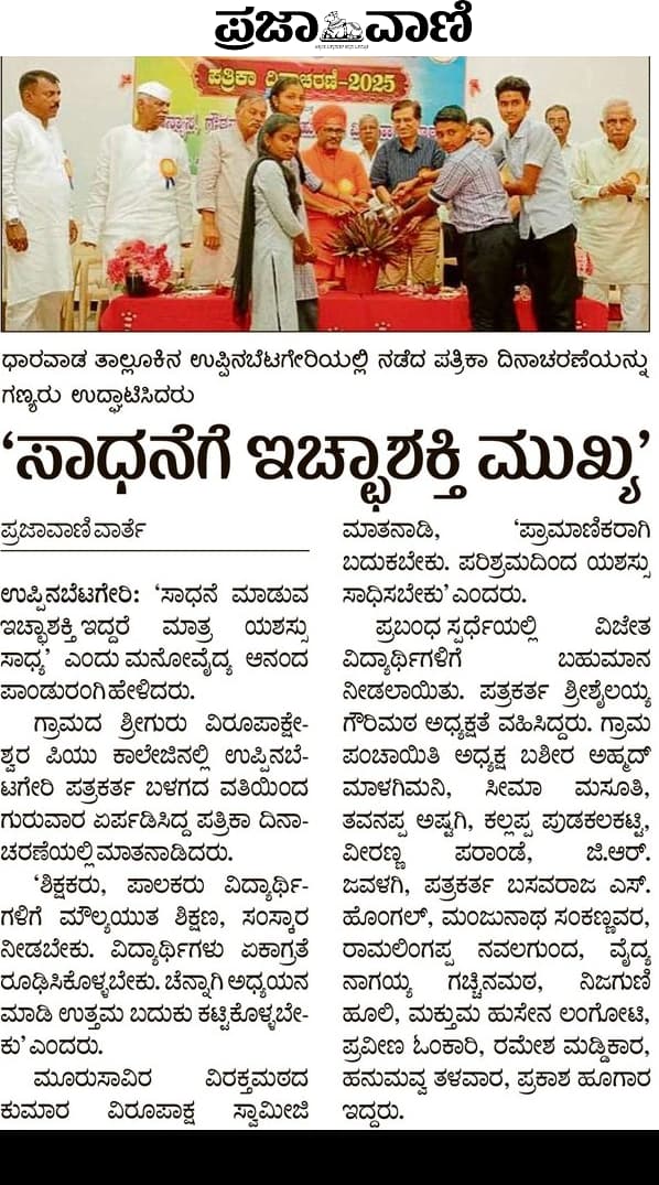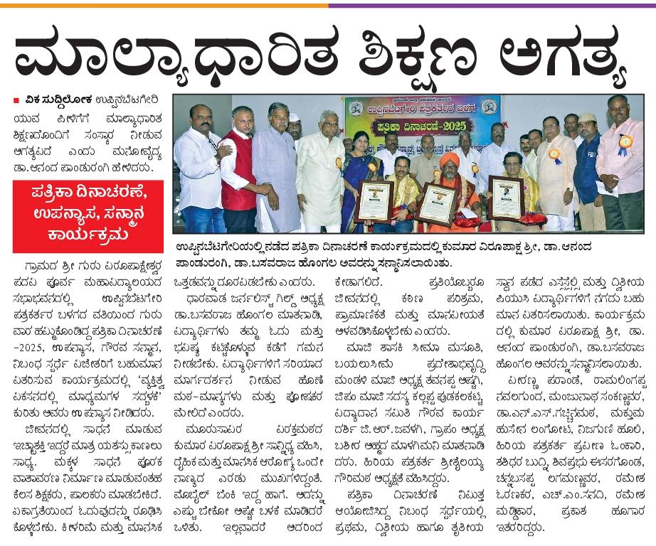 ಉಪ್ಪಿನಬೆಟಗೇರಿ: ಪತ್ರಿಕಾ ದಿನಾಚರಣೆಯಲ್ಲಿ ಕುಮಾರ ವಿರೂಪಾಕ್ಷ ಶ್ರೀ,ಡಾ|ಆನಂದ ಪಾಂಡುರಂಗಿ, ಡಾ।ಬಸವರಾಜ ಹೊಂಗಲ್ರನ್ನು ಸನ್ಮಾನಿಸಲಾಯಿತು.
